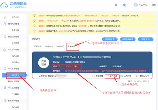 當(dāng)執(zhí)證人員因單位調(diào)動,需要辦理證書變更業(yè)務(wù)時,在“證書詳情”頁面,點擊“執(zhí)業(yè)企業(yè)變更”,系統(tǒng)自動檢測本人實名制認證、上傳證件照、聘用關(guān)系登記、無在辦理業(yè)務(wù)等條件,各項條件滿足,申請單由證書所在單位確認后才會提交至相關(guān)業(yè)務(wù)部門審查,審查完成后簽發(fā)電子證書,實現(xiàn)“一次不用跑”。操作流程:【我的證書】→【異常狀態(tài)】→【業(yè)務(wù)辦理】→【執(zhí)業(yè)企業(yè)變更】→【證書所在單位確認】→【業(yè)務(wù)提交至主管部門審核】,如下圖: